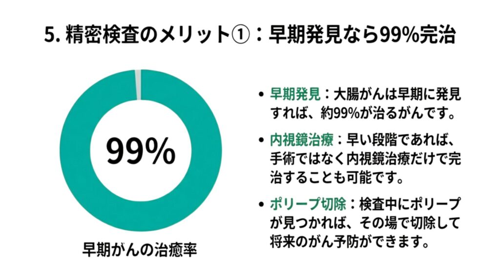 大腸がんは、早期に発見すれば約99%が治るがんです。精密検査を受けて早期発見できれば、内視鏡治療だけで完治することも可能です。