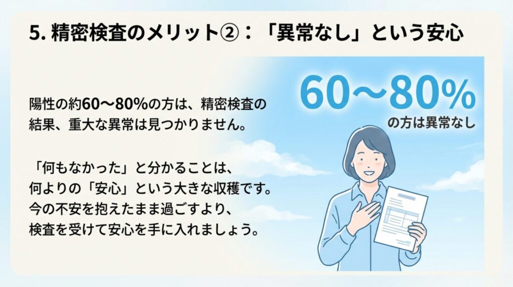 精密検査の結果、何も見つからなければ、それは「安心」という大きな収穫です。陽性の約60〜80%の方は、精密検査で重大な異常は見つかりません。
