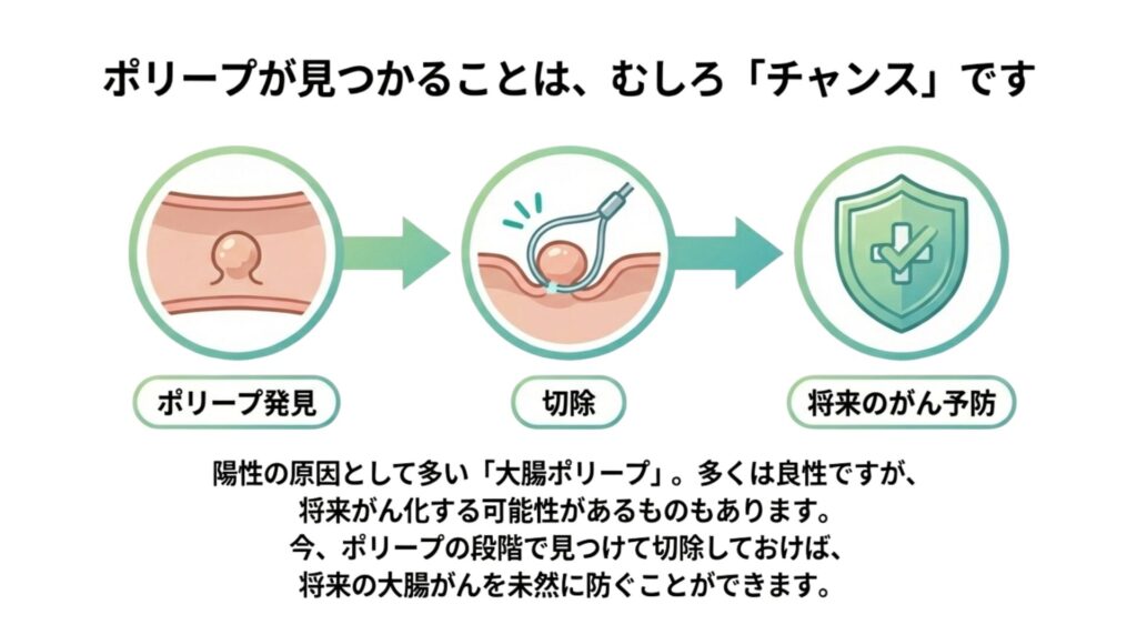 - 陽性でも大腸がんの確率は約2〜3%。多くは痔やポリープが原因