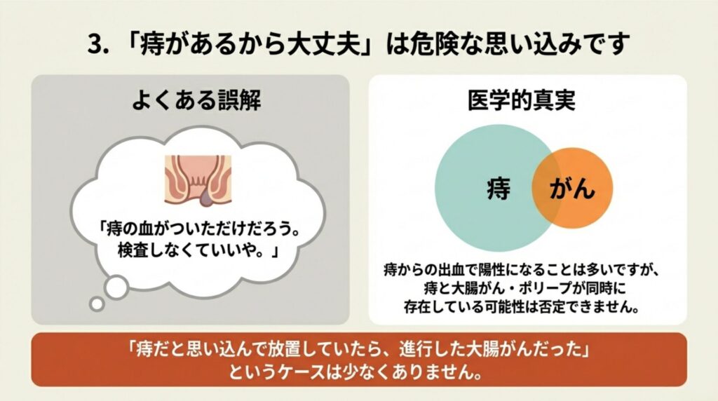 便潜血検査で陽性になったとき、最もやってはいけないのが**「痔があるから、きっとそのせいだ」と自己判断して放置すること**です。