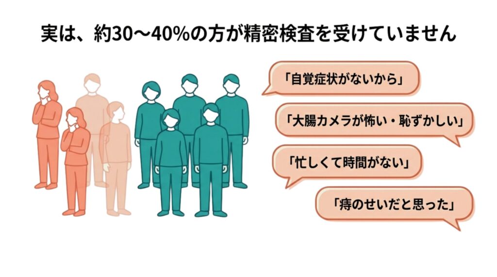 残念ながら、便潜血検査で陽性と判定されても、精密検査を受けていない方が約30〜40%いるのが現状です。