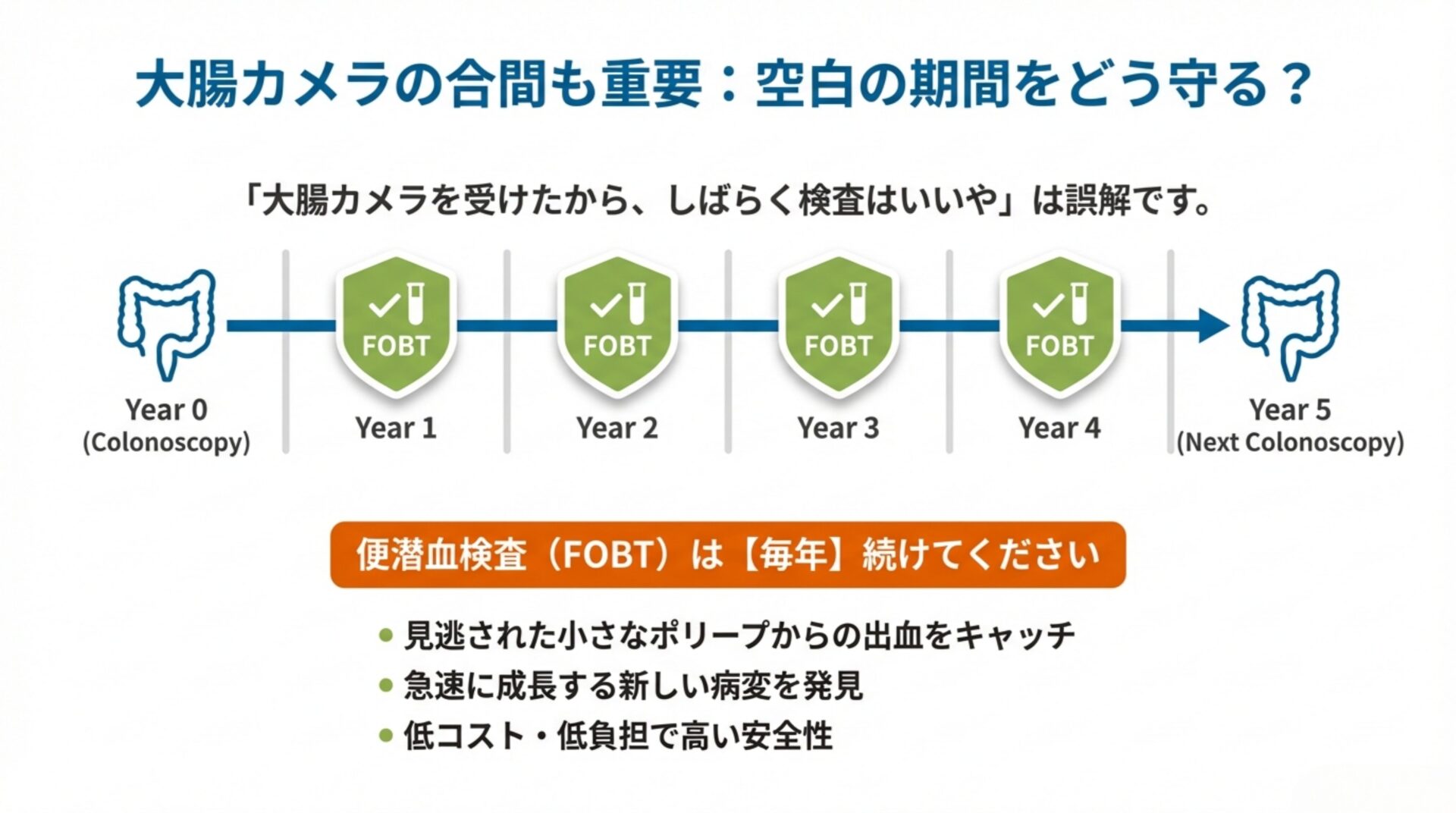大腸カメラ検査後、次の検査はいつ?フォローアップの考え方〜便潜血検査で陽性になったら」シリーズ5