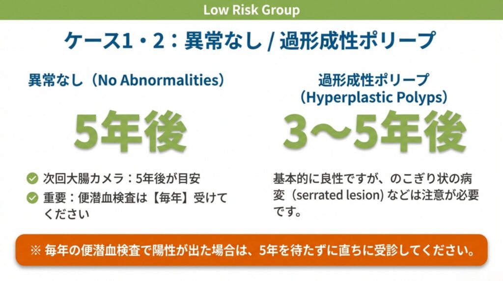 - 異常なし → 5年後に再検査、便潜血検査は毎年